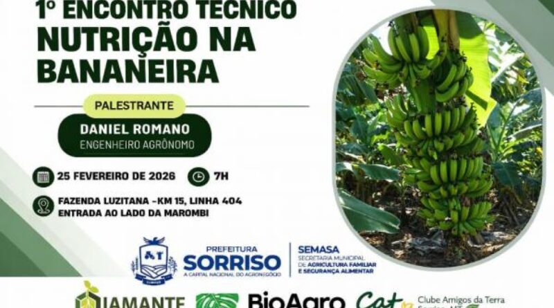 A bananicultura será tema do 1º Encontro Técnico Nutrição na Bananeira que acontece em Sorriso no próximo dia 25 de fevereiro, a partir das 07h. O evento será realizado na Fazenda Luzitana, localizada no km 15 da Linha 404, na saída para Lucas do Rio Verde, reunindo produtores, técnicos e profissionais do setor para um dia de aprendizado prático e troca de experiências.