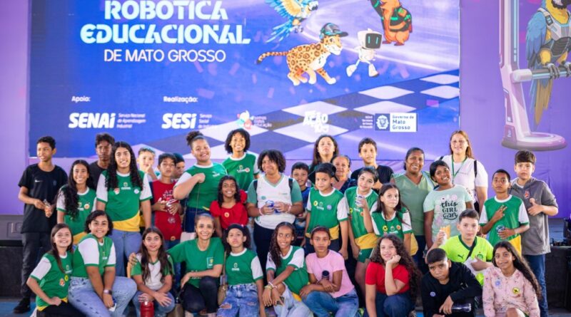 A foto ilustra um grupo de estudantes vestidos com uniforme oficial da Prefeitura de Cuiabá. No fundo, há uma tela azul indicando que se trata de um evento de robótica educacional.