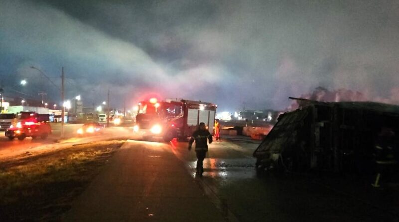 A equipe foi acionada pelo Centro Integrado de Operações de Segurança Pública (CIOSP) por volta das 23h38. No local, os bombeiros encontraram uma carreta que havia saído da pista depois que o pneu do cavalo mecânico estourou, ocasionando o tombamento do conjunto veicular e, em seguida, o incêndio.