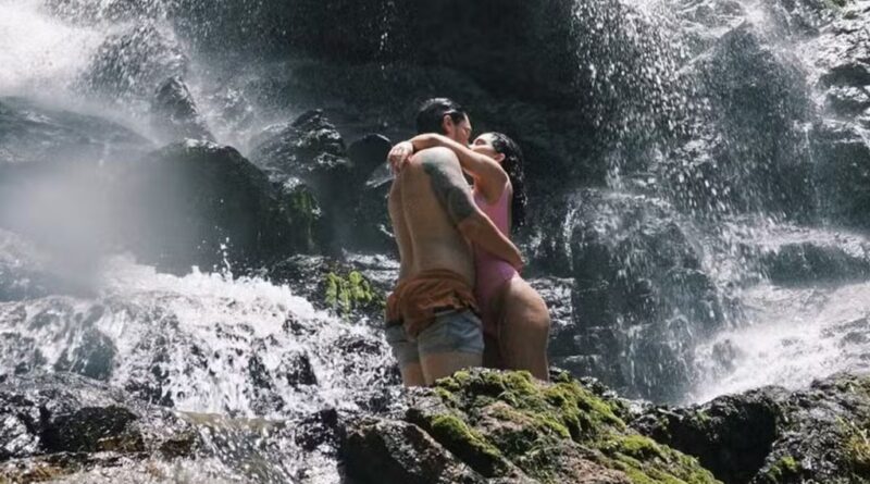 Carol Macedo, de 32 anos, compartilhou nas redes sociais fotos em que aparece tomando banho de cachoeira. Em alguns registros, ela surge sozinha; em outro, troca beijos com o marido, Rafael Eboli.