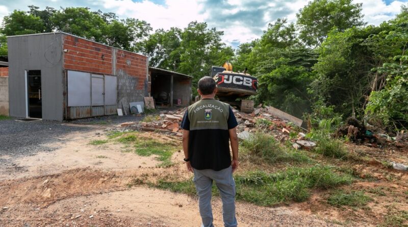 “Trata-se de uma obra clandestina em APP. O proprietário realizava a construção apenas aos finais de semana, o que impedia a autuação do responsável pela irregularidade. Diante disso, tomamos a decisão pela demolição, com apoio da Secretaria de Obras, responsável pela logística e pela remoção dos entulhos. Também contamos com a Energisa, que retirou um padrão de energia instalado em área pública, e com o suporte da Polícia Militar”, explicou Érico.
