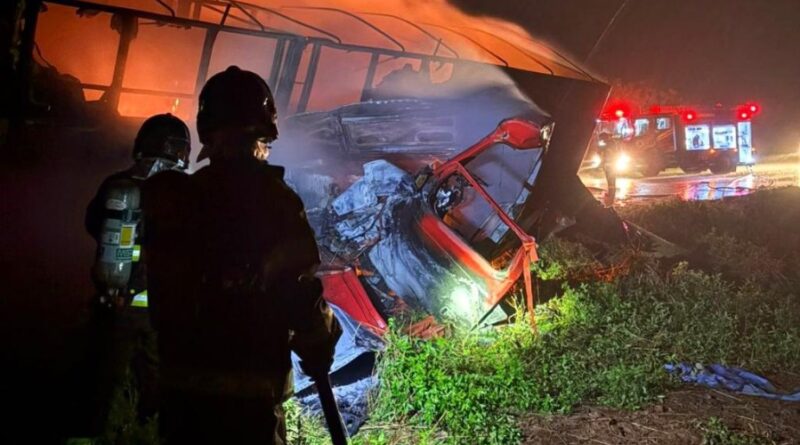 Corpo de Bombeiros combate incêndio em carretas após acidente na BR-364