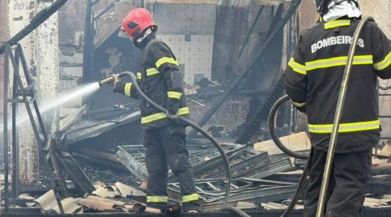Corpo de Bombeiros realiza rescaldo após incêndio de grandes proporções em loja de materiais de construção