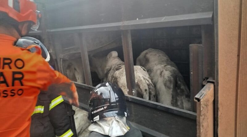 No local, os bombeiros encontraram o veículo tombado às margens da rodovia. O motorista, um homem de 45 anos, já havia saído da carreta, mas os animais permaneciam presos na estrutura metálica do veículo.