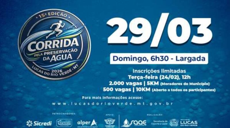 A Corrida Pela Preservação da Água 2026 estará com inscrições abertas a partir desta terça-feira (24), às 12h, em Lucas do Rio Verde. A tradicional corrida realizada no município integra as ações de incentivo ao esporte e à conscientização ambiental no município, reunindo atletas e comunidade em torno da importância da preservação dos recursos hídricos.