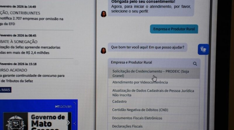 Para formalizar a adesão, o contribuinte deve realizar o login na Central de Atendimento usando o Gov.br ou MT Login e acessar a assistente virtual no canto inferior direito da tela. Em seguida, o usuário deve selecionar o perfil “Empresa e Produtor Rural” ou “Contador e Advogado” e escolher o serviço “Solicitação de Credenciamento – PRODEIC (Soja Granel)”.