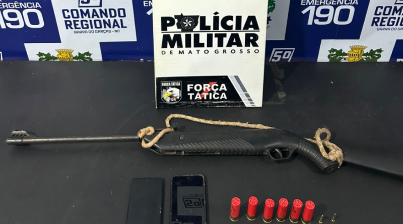 Policiais militares da Força Tática do 5º Comando Regional localizaram e prenderam um foragido da Justiça, de 42 anos, na zona rural do município de Barra do Garças (520 km de Cuiabá). As equipes apreenderam com o denunciado uma espingarda seis munições calibre 16 e outras duas calibre .22.