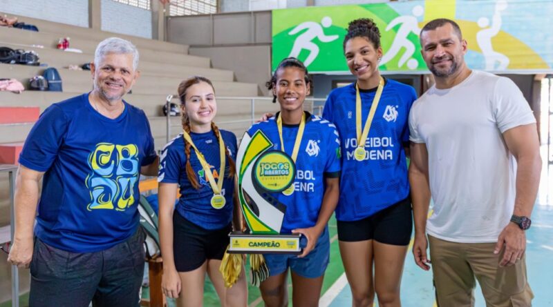 A imagem que acompanha a matéria mostra atletas da equipe Módena, campeãs do voleibol feminino, ao lado do coordenador-geral dos Jogos Abertos Cuiabanos, Dinho Ribeiro, e do secretário municipal de Esporte e Lazer, Jefferson Neves, durante a cerimônia de premiação.