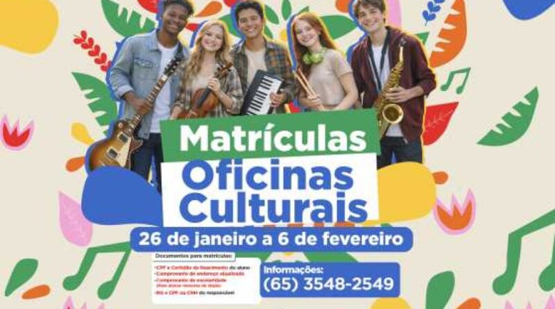 A Prefeitura de Lucas do Rio Verde, por meio da Secretaria de Cultura e Turismo, anuncia a abertura das matrículas para as Oficinas Culturais 2026. A partir do dia 26 de janeiro até 6 de fevereiro, os interessados poderão garantir sua vaga em diversas modalidades artísticas oferecidas pelo município.