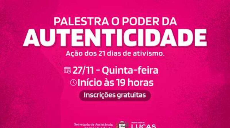 A campanha dos 21 Dias de Ativismo segue com um momento especial em Lucas do Rio Verde: o evento “O Poder da Autenticidade”, que acontece no dia 27 de novembro, às 19h, no Auditório do Paço Municipal. A entrada é gratuita.