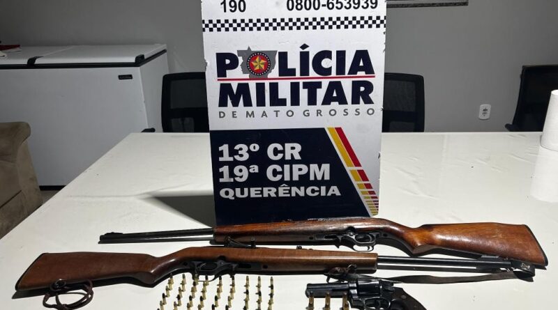 A Polícia Militar prendeu um homem, de 35 anos, por violência doméstica, ameaça e porte ilegal de arma, na manhã desta segunda-feira (8.12), no município de Querência. O suspeito foi denunciado por ameaçar a esposa com facas e armas de fogo. Com ele, foram apreendidos dois rifles, uma pistola e mais de 100 munições.