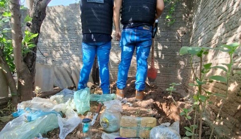 Durante a ação, os policiais localizaram e apreenderam pinos de cocaína fracionados e prontos para a comercialização, além de outros materiais típicos do tráfico. Parte do material entorpecente estava enterrado no fundo da residência.
