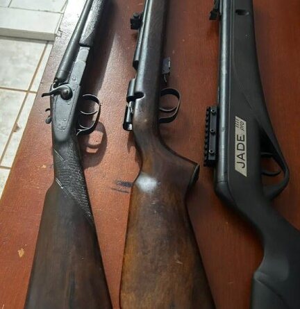 No decorrer da verificação no imóvel, os policiais localizaram duas armas de fogo e uma arma de pressão, que se encontravam guardadas no quarto utilizado pelo morador da residência. Não foi apresentada qualquer documentação legal que autorizasse a posse do armamento.