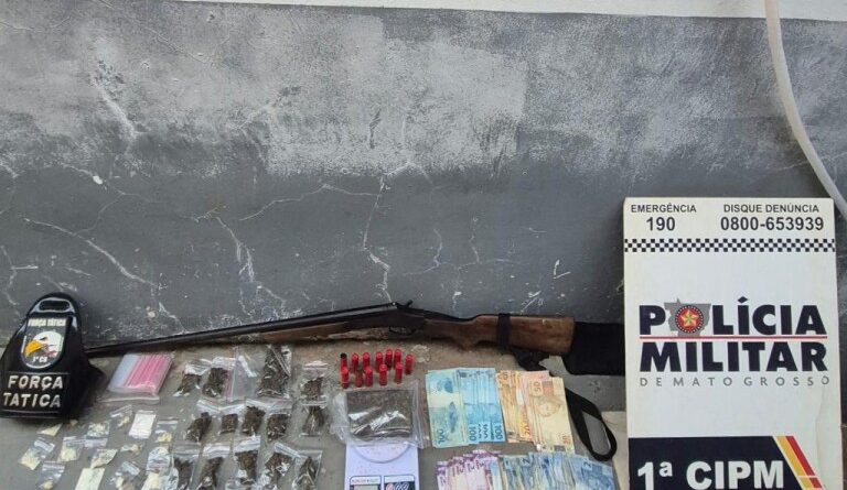 A Polícia Militar prendeu, nesta sexta-feira (21,11) um homem de 34 anos, por tráfico de drogas e posse irregular de arma de fogo, no distrito de Água Fria, em Chapada dos Guimarães. Com o suspeito, foram apreendidas porções análogas de maconha e pasta-base de cocaína, além de uma espingarda e munições.