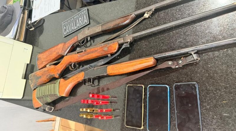 Questionado sobre as armas, o suspeito afirmou que estava com as espingardas para cuidar da propriedade rural a mando de uma mulher. Ele não apresentou documentação sobre as armas e foi detido.