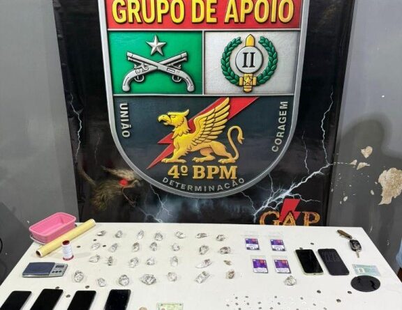 Na abordagem, os militares localizaram 10 porções de substância análoga à maconha. Em buscas no interior da residência, foram encontradas outras 18 porções do entorpecente, além de uma balança de precisão e materiais utilizados para embalagem da droga.