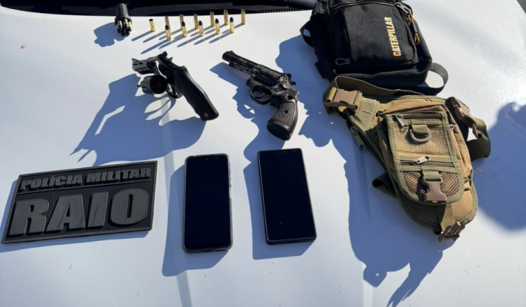 Em buscas no interior do veículo, os militares localizaram, no banco do passageiro, um revólver de calibre .357, sem numeração aparente e, em uma mochila, mais um revólver de calibre .38 e 18 munições do mesmo calibre.