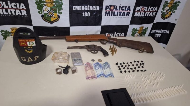 Policiais militares do 17º Batalhão prenderam um homem, por porte ilegal de arma de fogo e tráfico ilícito de drogas, nesta segunda-feira (16.2), em Lambari D’Oeste. Com o suspeito, foram apreendidas 119 porções de drogas entre cocaína, maconha e pasta base, além de um fuzil, um revólver e sete munições de calibre .38.