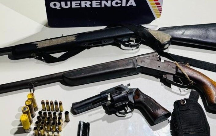 Durante as buscas na casa do suspeito, foram encontradas e apreendidas três armas de fogo, sendo uma espingarda calibre .22, uma espingarda calibre .20 e um revólver calibre .38. Além das armas, foram encontradas diversas munições e acessórios, incluindo um carregador para espingarda calibre .22 e um coldre.