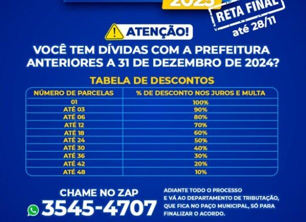 Tem dívidas com os cofres públicos municipais vencidos até 31 de dezembro de 2024? Lembre-se que termina no dia 28 de novembro o prazo para renegociação destes débitos com abatimentos de juros e multas. O Programa de Recuperação Fiscal de Sorriso, o Refis 2025, que terminaria em agosto, teve o prazo esticadinho, que se encerra neste mês.