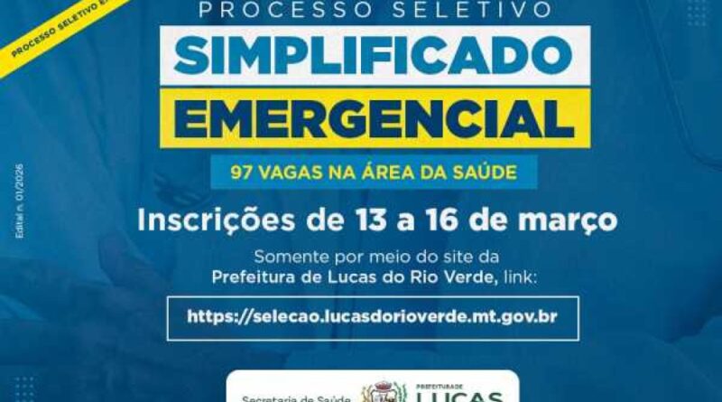 Começam nesta sexta-feira (13), as inscrições para o Processo Seletivo Simplificado Emergencial, Edital n. 01/2026, aberto pela Prefeitura de Lucas do Rio Verde.