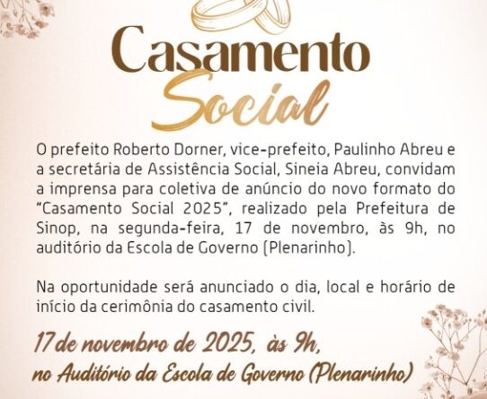 A Prefeitura de Sinop, por meio da Secretaria de Assistência Social, promove uma coletiva de imprensa, na próxima segunda-feira (17), às 9h, no auditório da Escola de Governo (Secretaria de Administração e Modernização) para lançar o Casamento Social 2025. Mais de 100 casais serão unidos em casamento civil promovido e custeado pelo Executivo Municipal.