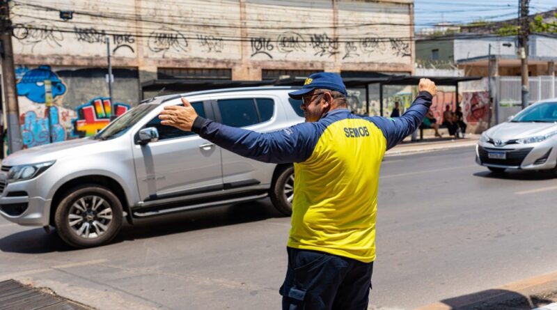 A imagem que acompanha o texto mostra um agente de trânsito e transporte, de camisa amarela, com os braços abertos em sinal de que há algum tipo de intervenção na via.