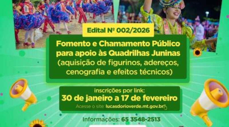 A Prefeitura de Lucas do Rio Verde, por meio da Secretaria Municipal de Cultura e Turismo, lançou o Edital de Chamamento Público nº 002/2026, voltado ao fomento das quadrilhas juninas do município. A iniciativa vai destinar R$ 45 mil para apoiar a criação, aquisição e qualificação de figurinos, adereços, cenários e efeitos técnicos de espetáculos juninos, fortalecendo uma das manifestações mais tradicionais da cultura popular brasileira.