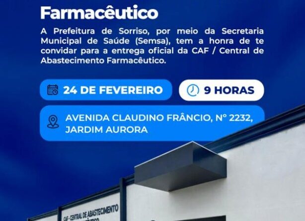 A Prefeitura de Sorriso, por meio da Secretaria Municipal de Saúde (Semsa), promove nesta terça-feira (24), às 9 horas, a entrega oficial da CAF – Central de Abastecimento Farmacêutico, localizada na Avenida Claudino Frâncio, nº 2232, no bairro Jardim Aurora.