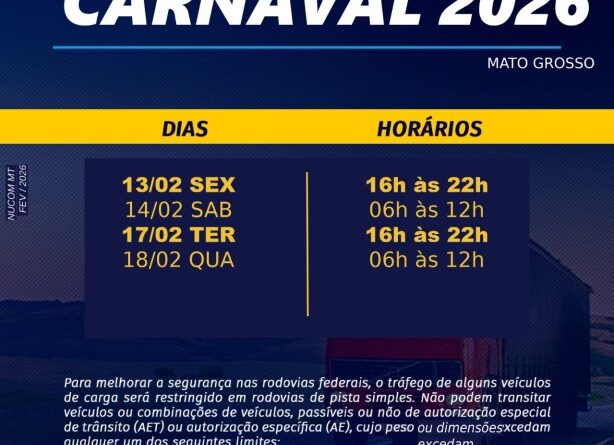 A Polícia Rodoviária Federal (PRF) inicia nesta sexta-feira (13) a Operação Carnaval 2026 em Mato Grosso, que segue até a Quarta-feira de Cinzas (18), com o objetivo de garantir a segurança e a fluidez do trânsito nas rodovias federais que cortam o estado. Neste ano, a operação tem como temática central o combate à alcoolemia, principal fator associado aos sinistros de trânsito mais graves.
