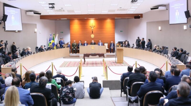 A foto ilustra o Procurador Geral do Município, Luiz Antônio Araújo Júnior, vestido de terno e gravata dourada. No fundo, é possível visualizar o pleno do Tribunal de Justiça no qual desembargadores marcam presença. Do lado esquerdo e direito, estão advogados e autoridades prestigiando uma solenidade de posse.