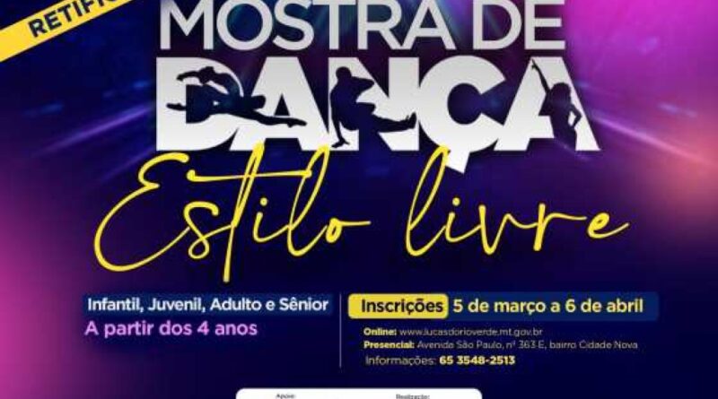 A Prefeitura de Lucas do Rio Verde, por meio da Secretaria Municipal de Cultura e Turismo (SMCT), publicou, nesta sexta-feira (13), a Retificação nº 01 do Regulamento da Mostra de Dança 2026, que altera o link de inscrição para participação no evento, passando a ser: https://forms.lucasdorioverde.mt.gov.br/portal/evento?id=XUDJL78P2KZ1GAE9CQFT.