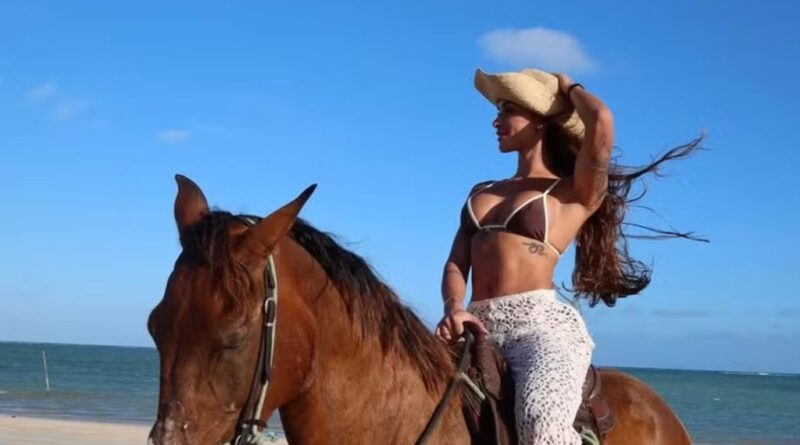Tainá Militão curte passeio a cavalo de biquíni em praia paradisíaca de Alagoas