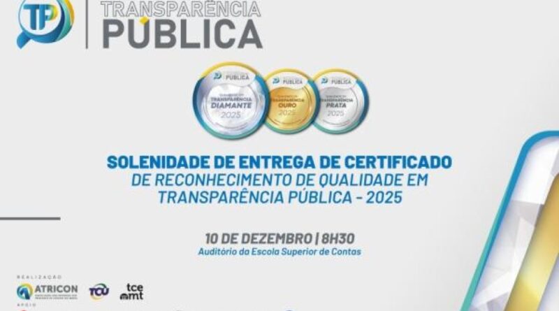O Tribunal de Contas de Mato Grosso (TCE-MT) realiza, às 9h desta quarta-feira (10), a solenidade de entrega de certificados de transparência pública para 124 instituições mato-grossenses que alcançaram nível de qualidade superior a 75% dos 130 critérios de avaliação do Programa Nacional de Transparência Pública (PNTP). O evento será no auditório da Escola Superior de Contas, com transmissão ao vivo pelo Canal do TCE no YouTube e pela TV Contas (canal 30.2).