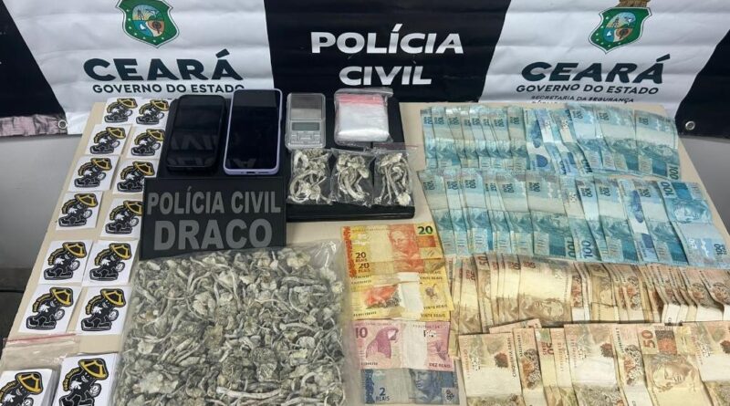 Após monitoramento, os policiais do Ceará conseguiram localizar o suspeito, que foi flagrado em posse de grande quantidade de cogumelos alucinógenos prontos para venda, R$ 6 mil em dinheiro e aparelhos celulares.
